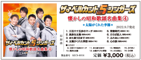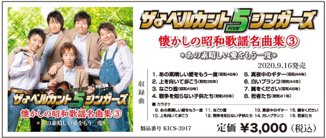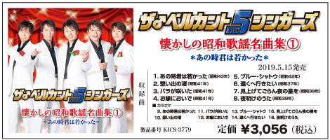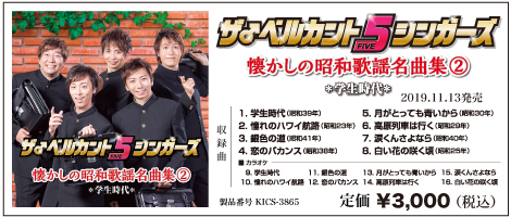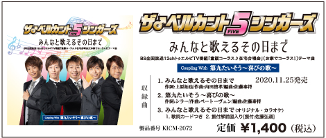 全国各地で展開する「童謡コーラス」の指導員や「みんなの音楽会」の演奏員らで構成された男性声楽家グループ「ザ♂ベルカントシンガーズ」から、さらに選ばれし5人のユニットグループ「ザ♂ベルカント5シンガーズ」は、音楽生涯学習活動団体の会員様のご支持のもと「生涯学習活動」の魅力と役割をテレビや舞台で全国に啓発しています!